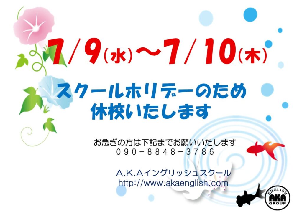 7月のスクールホリデー❣ 2025.07.01 お知らせ 📩メールでのお問い合わせ 【info@akaenglish.com】 📞お電話でのお問い合わせ 【0493-25-2417】 月~火・木~金 13:00~20:00 水曜日 17:00~20:00 土曜日 13:00~17:00