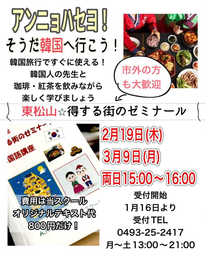 東松山市・得する街のゼミナール【韓国語講座】 2026.01.12 イベント 東松山市のまちゼミに参加しています。市街の方も大歓迎 2026年2月19日(木)・3月9日(月)どちらも15:00~16:00 費用は当スクールオリジナルのテキスト代800円だけ! 韓国人の先生と韓国旅行ですぐに使える韓国語会話を 珈琲や紅茶を飲みながら楽しく学びましょう♪ お申込みは1月16日からお電話で0493-25-2417 13:00~20:00(日曜定休)